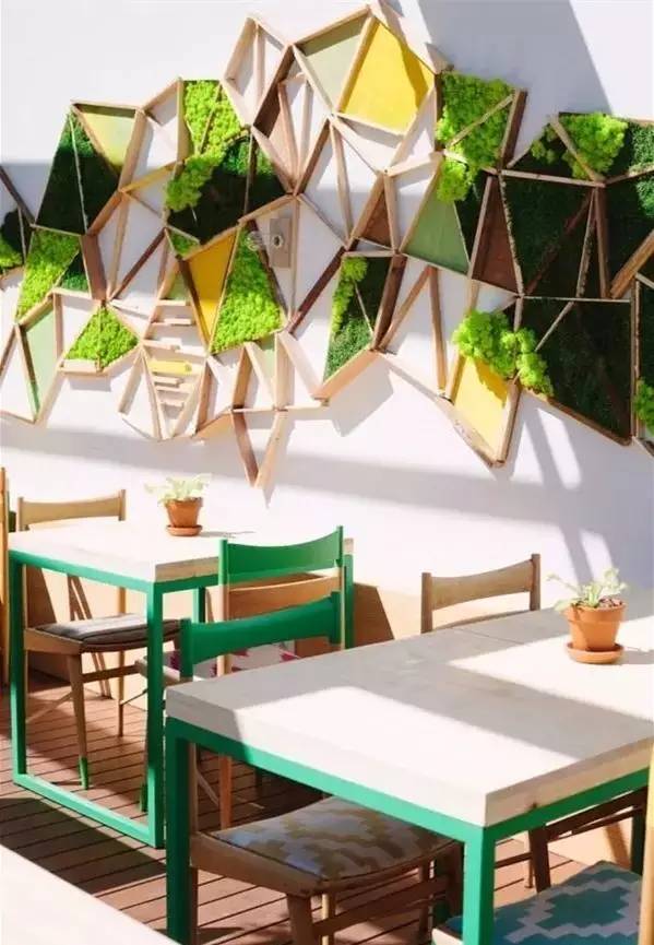 2 種在墻面的綠植 利用三角形幾何圖案,在里面種植苔蘚等小植物,在里面種植苔蘚等小植物。